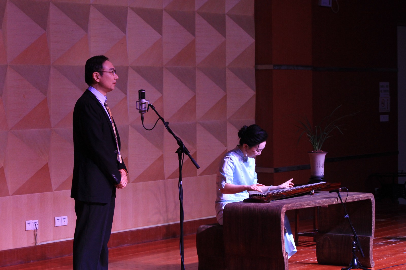 音乐会以“丝桐文心”为主题,依次上演七首不同风格的古琴名曲,特邀嘉宾刘芊担任音乐会导聆并伴唱。音乐会在一首充满神秘色彩的古乐声——《神人畅》中缓缓拉开帷幕。乐曲章法严谨,泛音段落和散按段落结构相同,带领听众穿越回上古祭祀现场,仿佛听见神明的低语。《关山月》伴以导聆嘉宾刘芊的琴歌演唱,更显苍凉凄楚、雄浑深情,淋漓尽致得浮现出戍边将士的思乡之情。琴箫合奏《梅花三弄》,旋律清新,节奏鲜明,刻画了梅傲寒霜的清雅高洁品质。《忆故人》反复咏叹的曲调,委婉细腻,缠绵悱恻,感人至深,指间充满了别后难会而生思慕的默默忆旧深情。《阳关三叠》配以琴歌,变化反复,韵味独特,情真意切,深刻表达了对远行友人依依惜别的深情。《离骚》乐曲跌宕起伏,沉郁顿挫,如泣如诉,表现了屈原悲天悯人的家国情怀和不与世俗同流合污的高洁品质;琴声与导聆嘉宾刘芊的诗歌朗诵交相辉映,更加彰显琴乐与文学不可分割的深层关联。音乐会在时而悲壮激越,时而哀婉低徊的《广陵散》中落下帷幕。现场听众陶醉其中,掌声经久不息。