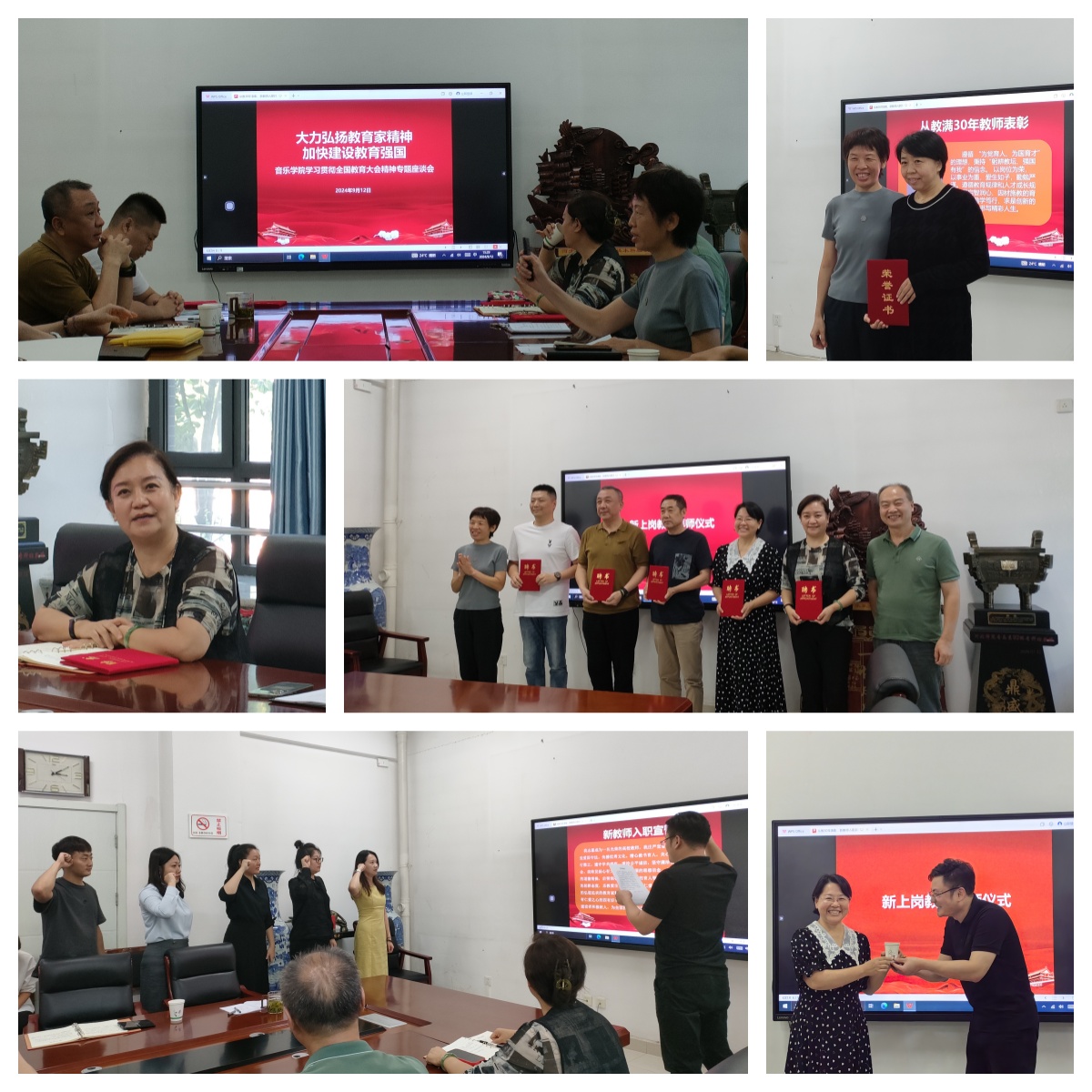 9月12日下午,QY千亿球友会“从教30年表彰、新员工入职拜师仪式暨学习全国教育大会精神专题座谈会”在106会议室举行。