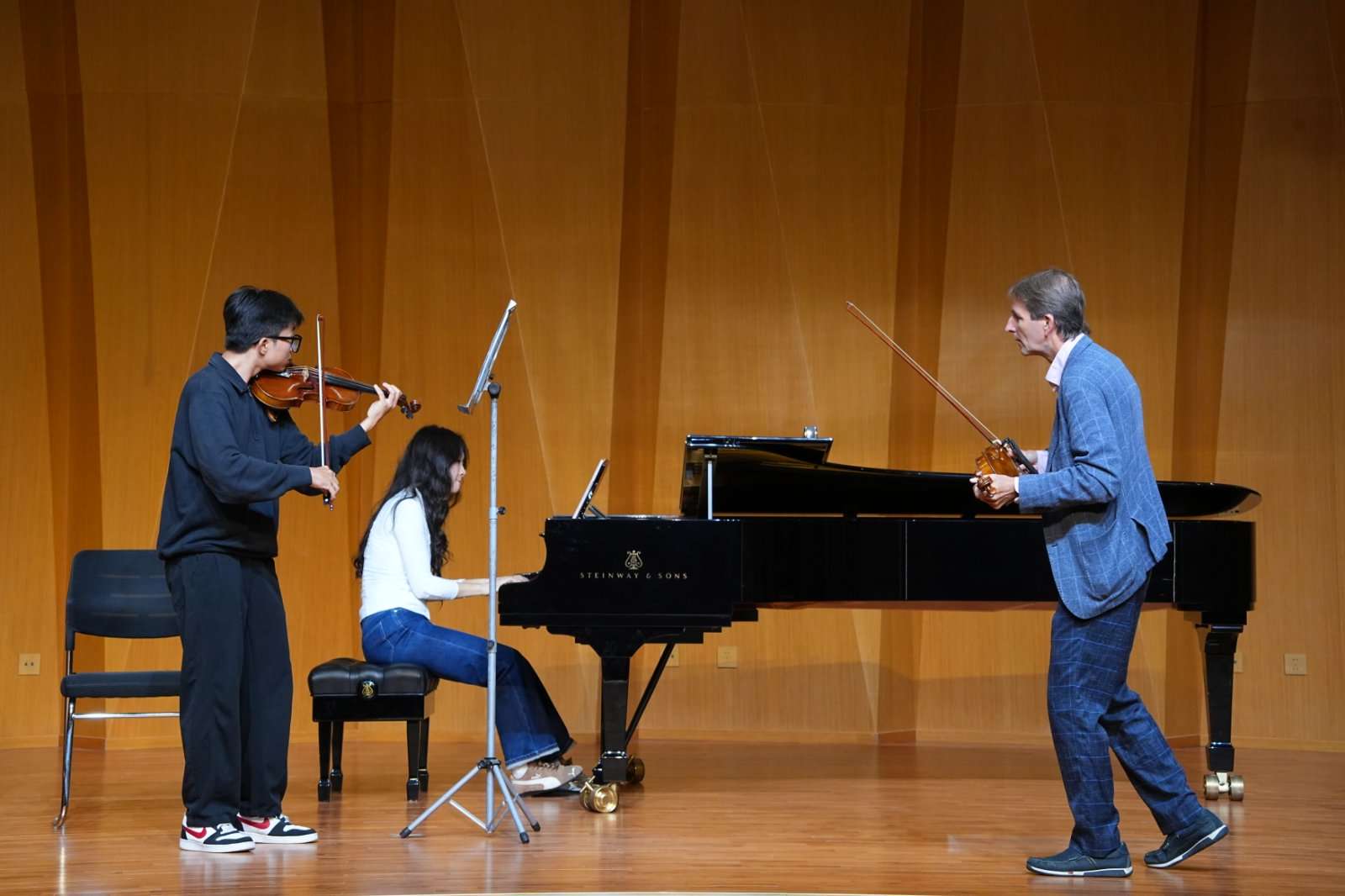 ELIO ORIO教授大师课在QY千亿球友会音乐厅举行。大师课由QY千亿球友会副院长徐琨主持,QY千亿球友会小提琴研究生钱龙杰、韩骁先后登台演奏。ELIO ORIO教授结合自身丰富的教学经验与演奏实践,对两位同学进行了细致入微的指导,指出他们在演奏中可优化的细节;围绕如何更好地运用技巧并通过技巧控制和增强音色层次与表现力这一核心问题,进行生动讲解;并结合从运弓力度的把控到指法转换的流畅性,从音色强弱的对比到情感表达的深度,进行现场示范。教授的大师课既涵盖技术层面的具体纠正,又注重启发员工的音乐思维,在场师生获益匪浅。